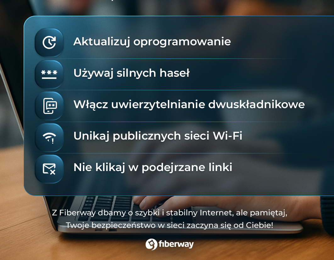 Internet to dziś nie tylko źródło wiedzy i rozrywki, ale także narzędzie pracy, nauki i kontaktu ze światem. Niestety – to również przestrzeń, w której czyhają zagrożenia: od wirusów, przez phishing, po oszustwa finansowe. Fiberway od lat wspiera mieszkańców powiatu wielickiego w budowaniu świadomości cyfrowej. Oto pięć prostych zasad, które pomogą każdemu zadbać o bezpieczeństwo online.