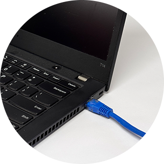 przychodzący z zewnątrz przewód Ethernetowy typu skrętka, zakończony wtyczką RJ45.
